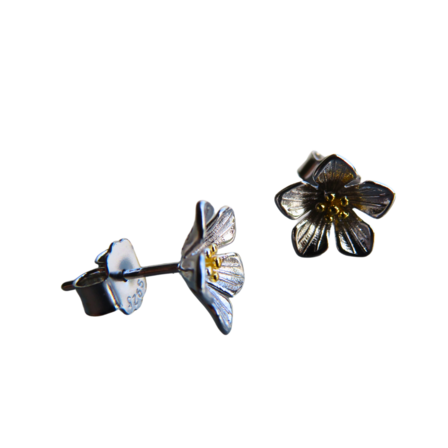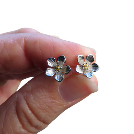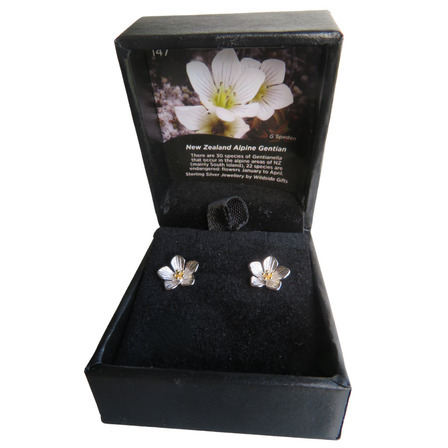 Exquisite, delicate Alpine Gentian flower stud earrings in solid sterling silver with gold tipped anthers. They come in a beautiful Wildside Gifts jewellery box.