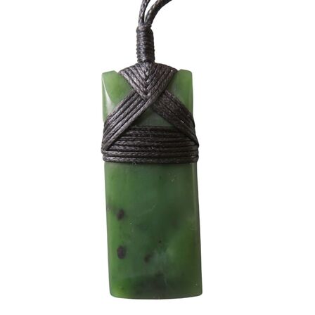 Beautiful Pounamu Toki bound by black cord, approximately 51-57mm long by 18mm to 20mm wide. Carved in New Zealand.